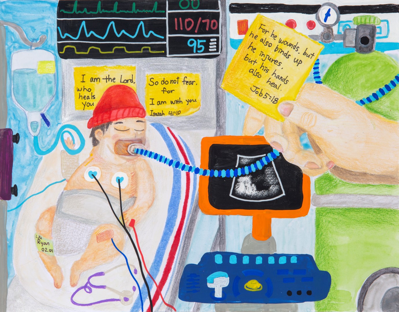 I drew this because I want to share how God has acted upon my life. When I was a baby, I had lung problems, and my parents were told I wouldn’t make it. My parents nevertheless continued to put their faith in God and prayed that I would be healed. One of the nurses put post-it notes with Bible verses written on them to help me in my struggle.