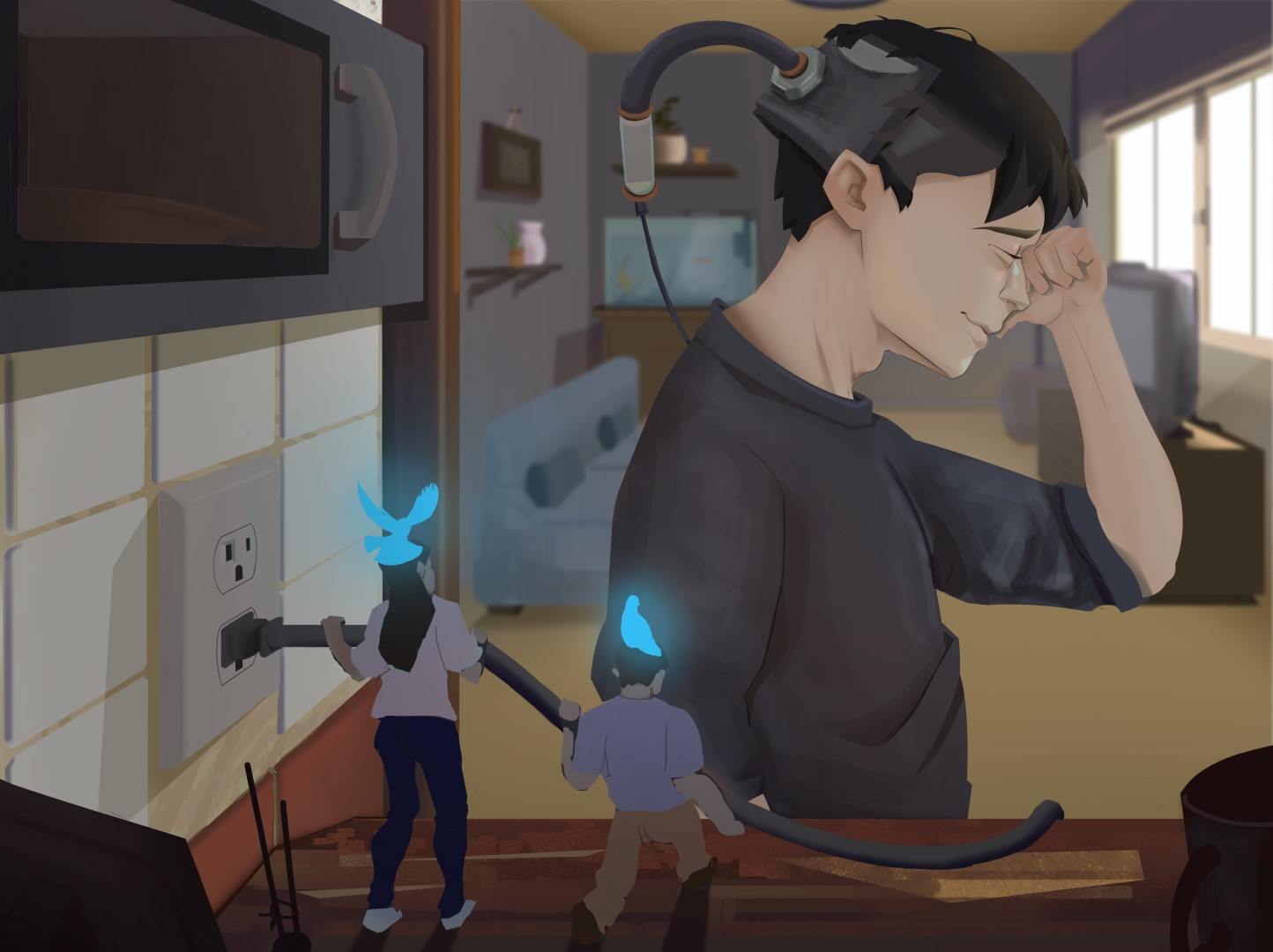 I wanted to create a piece that spoke to me for this contest, so I made one that showcased how I personally was able to be restored during the recent hard times that I went through. In this digital illustration, there's a boy with a lifeline attached to his head, and that's what's keeping him charged and alive. The people helping to keep the plug charged in for the boy's lifeline are his parents, with doves on their heads representing God Himself, who's watching over the boy as well. The boy is revitalized with the lifeline plugged in and is crying with joy, as he's now aware he's been saved by the loved ones around him and reminded of God's constant love and care for Him as well.