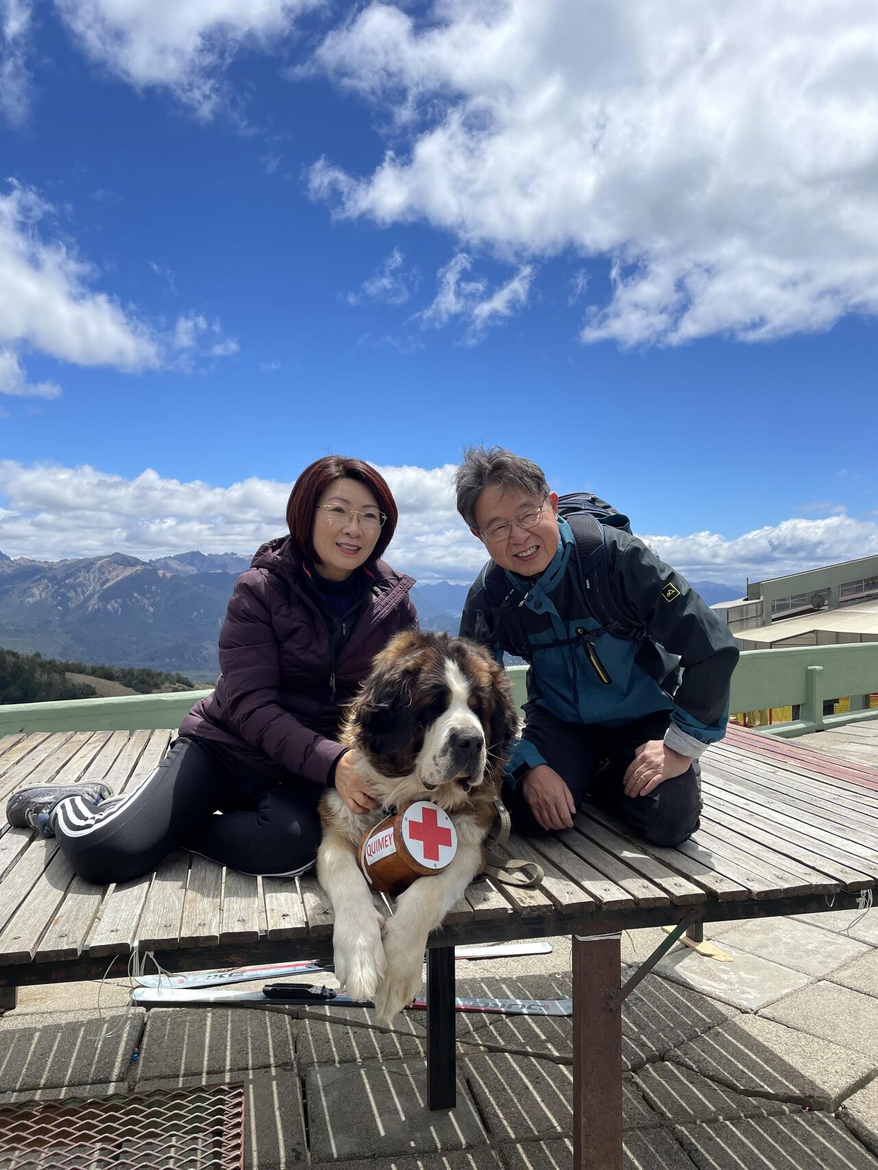 사방이 꽃나무들로 장식된 호숫가 카페에서 티타임을 마친 후 사인승 케이블카를 타고 산 정상에 올라 저 아래 보이는 도시 전경을 감상하는데 전망대 한편에서 한 가족이 커다란 개 한 마리를 사이에 두고 사진을 찍고 있는 것이 아닌가.